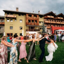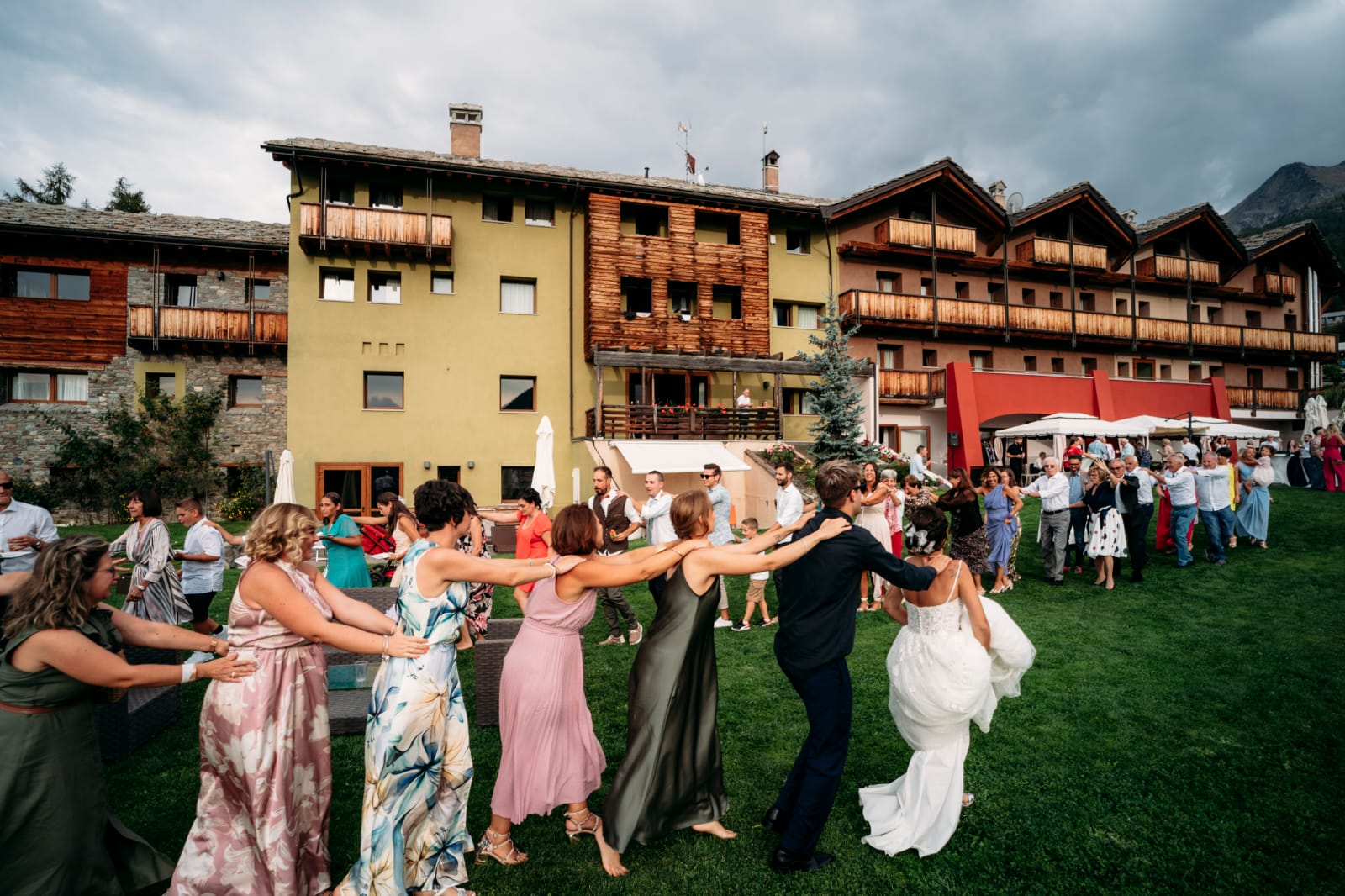 Dopo la cerimonia, gli ospiti saranno accolti su un grosso prato panoramico, dove il sole tramonta lentamente dietro le montagne. Finger food, bollicine e specialità locali accompagnano un momento conviviale e rilassato, con un panorama che lascia senza fiato.